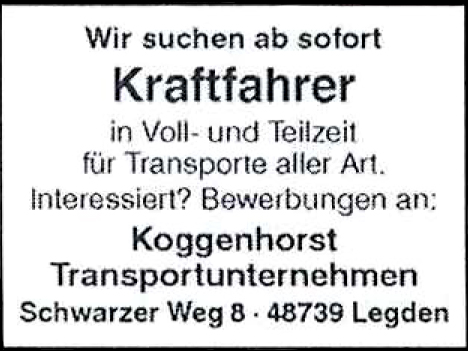 Wir suchen ab sofort Kraftfahrer (Führerscheinklasse C/CE) in Voll- und Teilzeit für Transporte aller Art. Interessiert? Bewerbungen an: Koggenhorst...